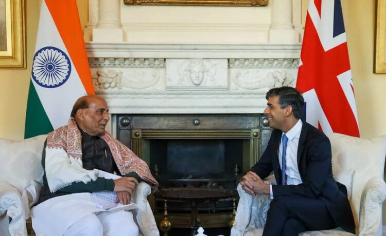 लंदन। ब्रिटेन के दौरे पर गए भारतीय रक्षा मंत्री राजनाथ सिंह ने लंदन में प्रधानमंत्री ऋषि सुनक से मुलाकात की। दोनों नेताओं की मुलाकात ब्रिटिश पीएम के आधिकारिक निवास 10 डाउनिंग स्ट्रीट, लंदन में हुई। इस दौरान रक्षा मंत्री राजनाथ सिंह ने कहा कि दोनों देशों ने अपने ऐतिहासिक संबंधों को आधुनिक, बहुआयामी और पारस्परिक रूप से लाभप्रद साझेदारी में ढालने में महत्वपूर्ण प्रगति की है।