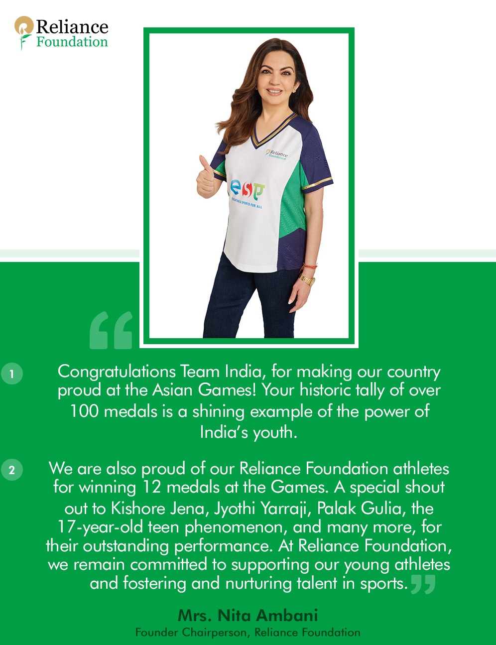 एशियाई खेलों में भारत की विशाल जीत पर खुशी जाहिर करते हुए रिलायंस फाउंडेशन की फाउंडर चेयरपर्सन नीता अंबानी ने कहा “100 से अधिक मेडल्स जीतने पर टीम इंडिया को बधाई! एशियन गेम्स में हमारा तिरंगा शान से लहरा रहा है। हमें रिलायंस फाउंडेशन के युवा एथलीट्स पर भी बहुत गर्व है। जिन्होंने एशियाई गेम्स में 12 से अधिक मेडल्स जीते हैं। किशोर जेना, ज्योति याराजी, 17 साल की पलक गुलिया और रिलायंस फाउंडेशन से जुड़े हुए सभी एथलीट्स को भी बहुत बधाई । रिलायंस फाउंडेशन हमेशा टीम इंडिया के साथ खड़ा रहेगा। बस आप भारत का गौरव यूंही बढ़ाते रहें।“