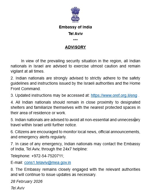 बढ़ते तनाव के बीच भारत सरकार ने इज़रायल में रह रहे भारतीय नागरिकों के लिए एडवाइजरी जारी की है। भारतीयों से कहा गया है कि वे अत्यंत सावधानी बरतें और हर समय सतर्क रहें। एडवाइजरी में स्पष्ट किया गया है कि मौजूदा सुरक्षा स्थिति को देखते हुए सभी भारतीय नागरिक स्थानीय प्रशासन और इज़रायली गृह मोर्चा कमान द्वारा जारी दिशा-निर्देशों का सख्ती से पालन करें। अनावश्यक आवाजाही से बचें और सुरक्षा प्रोटोकॉल का पालन करें।