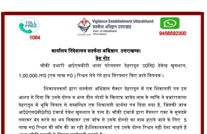 उत्तराखण्ड में भ्रष्टाचार के खिलाफ मुख्यमंत्री पुष्कर सिंह धामी द्वारा चलाए जा रहे सख्त अभियान के अंतर्गत एक और बड़ी सफलता प्राप्त हुई है। सतर्कता अधिष्ठान की टीम ने आज देहरादून स्थित पटेलनगर थाना क्षेत्र के आईएसबीटी चौकी प्रभारी उपनिरीक्षक देवेन्द्र खुगशाल को एक लाख रुपये की रिश्वत लेते हुए रंगे हाथों गिरफ्तार किया है।