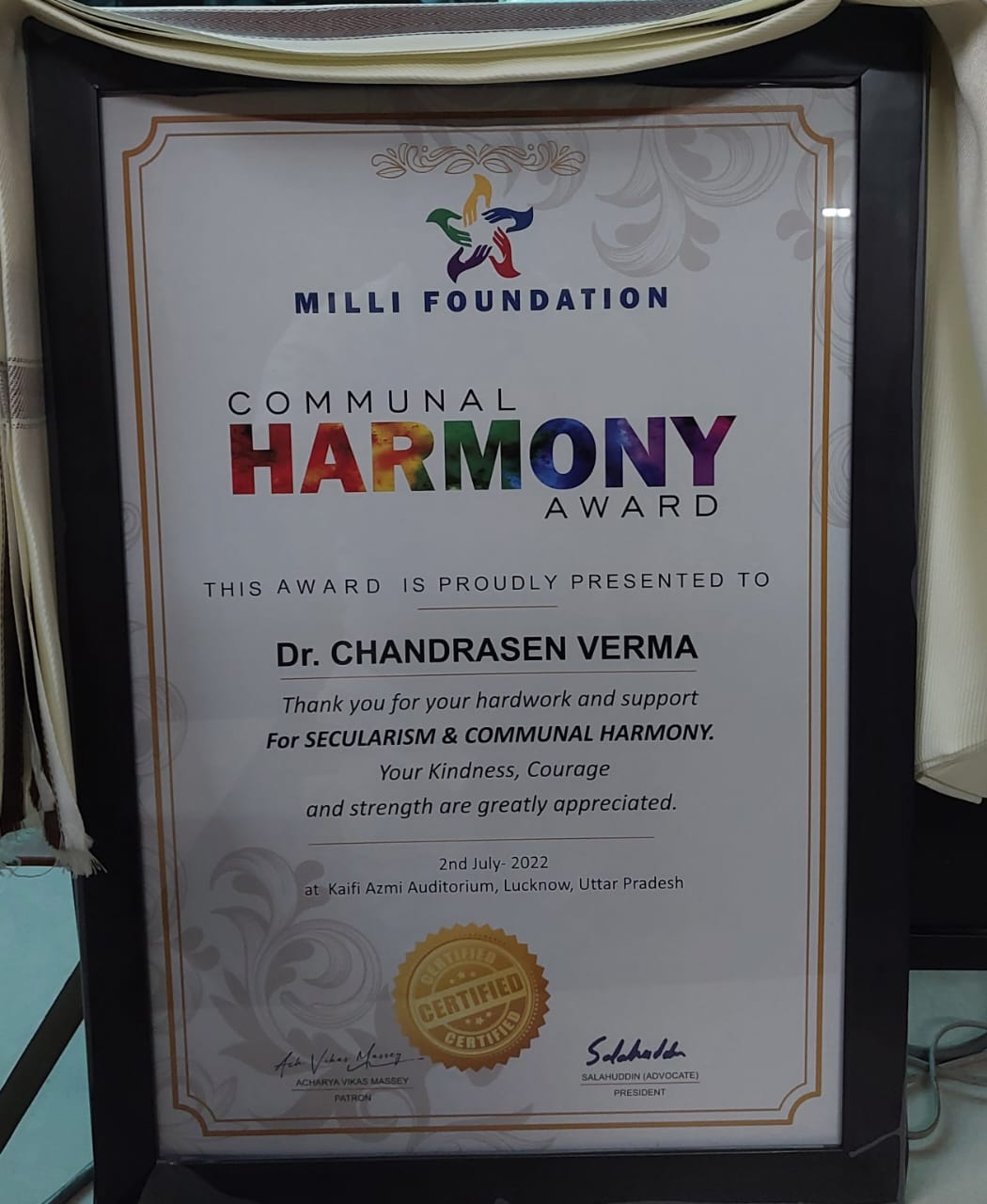 इस मौके पर समाज के विभिन्न क्षेत्रों में सामाजिक समरसता एवं सांप्रदायिक सद्भाव बनाए रखने के लिए पत्रकारों समाजसेवियों और नागरिकों का अभिनंदन किया गया। इस मौके पर राष्ट्रीय चैनल न्यूज़ इंडिया के नेशनल हेड डॉ चंद्रसेन वर्मा जी को भी समाज में सांप्रदायिक सौहार्द और सामाजिक समरसता बनाए रखने के लिए सम्मानित किया गया। डा. चंद्रसेन वर्मा की ओर से न्यूज इंडिया के एसोसिएट एडिटर शेखर आनंद त्रिवेदी ने इस सम्मान को स्वीकार किया।