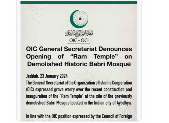इस्लामिक सहयोग संगठन के बयान के अनुसार OIC के महासचिव ने अयोध्या में पूर्व निर्मित बाबरी मस्जिद को ध्वस्त किए जाने और उसकी जगह बने राम मंदिर के उद्घाटन की निंदा की। आपकी जानकारी के लिए बता दें कि OIC एक भारत विरोधी संगठन है। पाकिस्तान इसका सक्रिय सदस्य है।