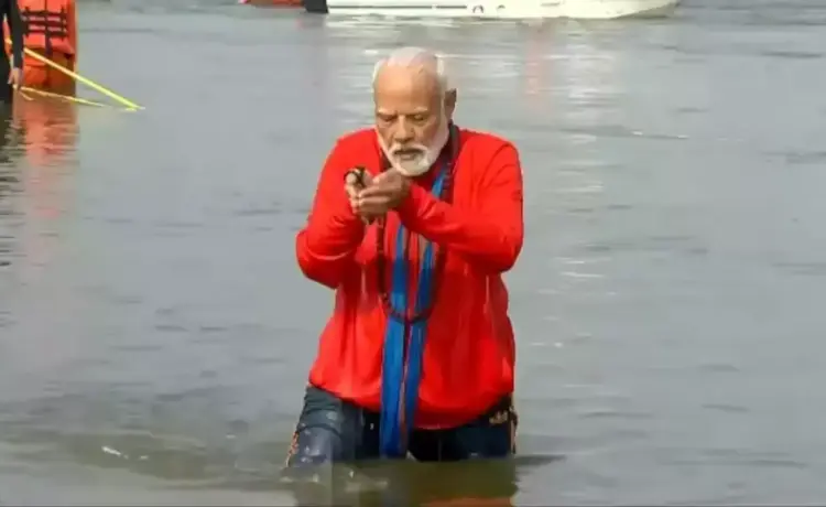 महाकुम्भनगर। प्रधानमंत्री नरेंद्र मोदी ने बुधवार को प्रयागराज महाकुम्भ में त्रिवेणी संगम स्नान किया। इस ऐतिहासिक और विशेष स्नान को उन्होंने अद्भुत बताया। सोशल मीडिया प्लेटफॉर्म एक्स पर पीएम मोदी ने संगम में स्नान की तस्वीरों को साझा करते हुए लिखा कि मां गंगा का आशीर्वाद पाकर मन को असीम शांति और संतोष मिला। यही नहीं पीएम मोदी ने ये भी बताया कि उन्होंने मां गंगा से सभी देशवासियों के सुख-समृद्धि, आरोग्य और कल्याण की भी कामना की। उल्लेखनीय है कि बुधवार को त्रिवेणी संगम में स्नान के दौरान पीएम मोदी ने वैदिक मंत्रोच्चारण के बीच पूजा अर्चना के साथ ही संगम आरती भी की और संगम तटों पर मौजूद श्रद्धालुओं का अभिवादन भी किया।