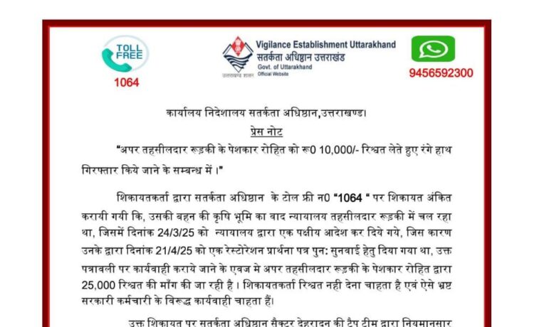यह कार्रवाई उस शिकायत के आधार पर की गई, जो टोल फ्री नंबर 1064 पर दर्ज कराई गई थी। शिकायतकर्ता ने अवगत कराया कि उसकी बहन की कृषि भूमि से संबंधित वाद न्यायालय तहसीलदार, रुड़की में लंबित है। 21 अप्रैल को उसने पुनः सुनवाई के लिए एक रेस्टोरेशन प्रार्थना पत्र प्रस्तुत किया था, जिसके निस्तारण के एवज में अपर तहसीलदार रुड़की के पेशकार रोहित निवासी मकान संख्या 273, ग्राम कस्बा रुड़की, हरिद्वार